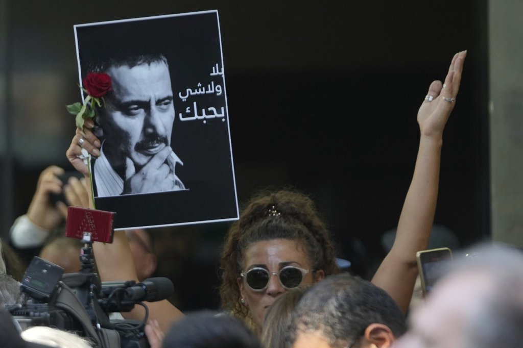 Hundreds of people holding roses and photos gathered by Khoury Hospital near Beirut’s busy Hamra district, solemnly singing some of his most famous songs and applauding as a vehicle carrying his body left its garage.