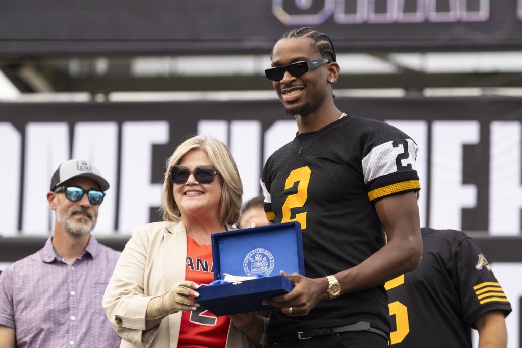 Gilgeous-Alexander received the key to the city of Hamilton from Mayor Andrea Horwath at a public rally Thursday at Hamilton Stadium.