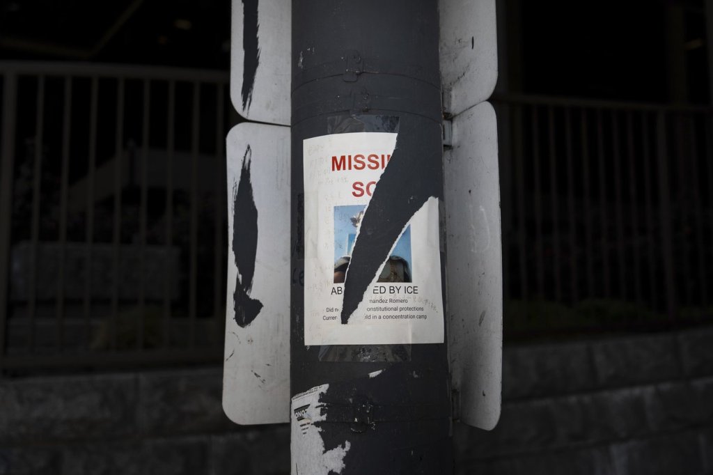 A torn missing person flyer, for an immigrant believed to be detained by ICE, is posted on a pole in Los Angeles, Saturday, July 19, 2025. (AP Photo/Jae C. Hong)