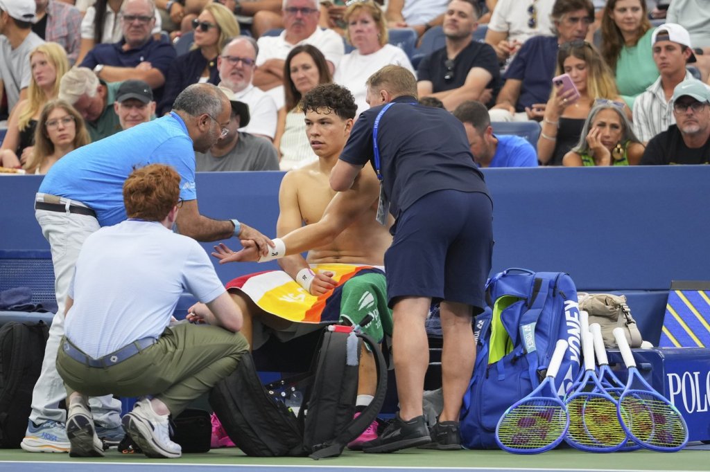 Shelton landed on his left arm after lunging to track down a ball in the corner on the final point to win the third set. Early in the fourth, the 2023 U.S. Open semifinalist began wincing and said to his coach’s box: “I did something to my shoulder. I don’t know what it is.”