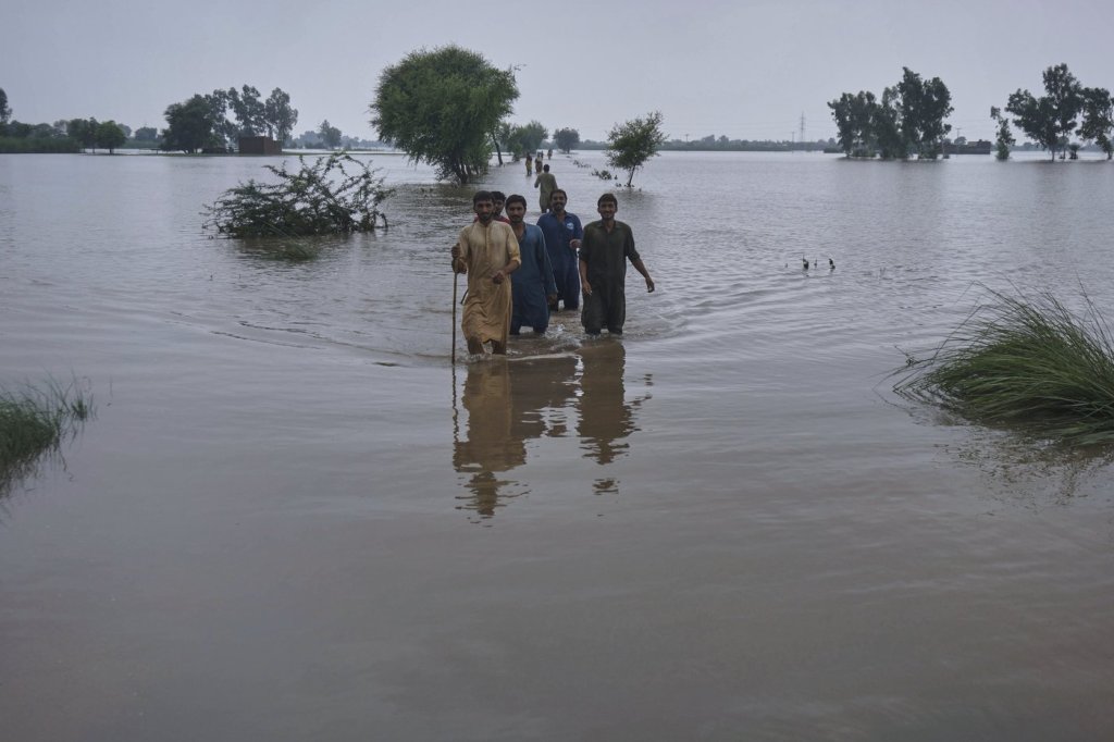 Local authorities were evacuating people and using educational institutions, police and security facilities as rescue camps, she said. Pakistani TV channels showed people clambering into rescue boats and sailing across fully submerged farmland to safety. Others loaded belongings into boats, salvaging what remained from damaged homes, now abandoned.