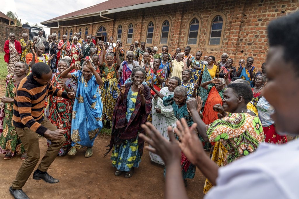 Gift Amumpeire, left, a field assistant with Reach One Touch One Ministries dances with members of the elderly community at their biweekly fellowship gathering at a church, Wednesday, Nov. 20, 2024, in Rwamucucu, Western Region of Uganda. (AP Photo/David Goldman)