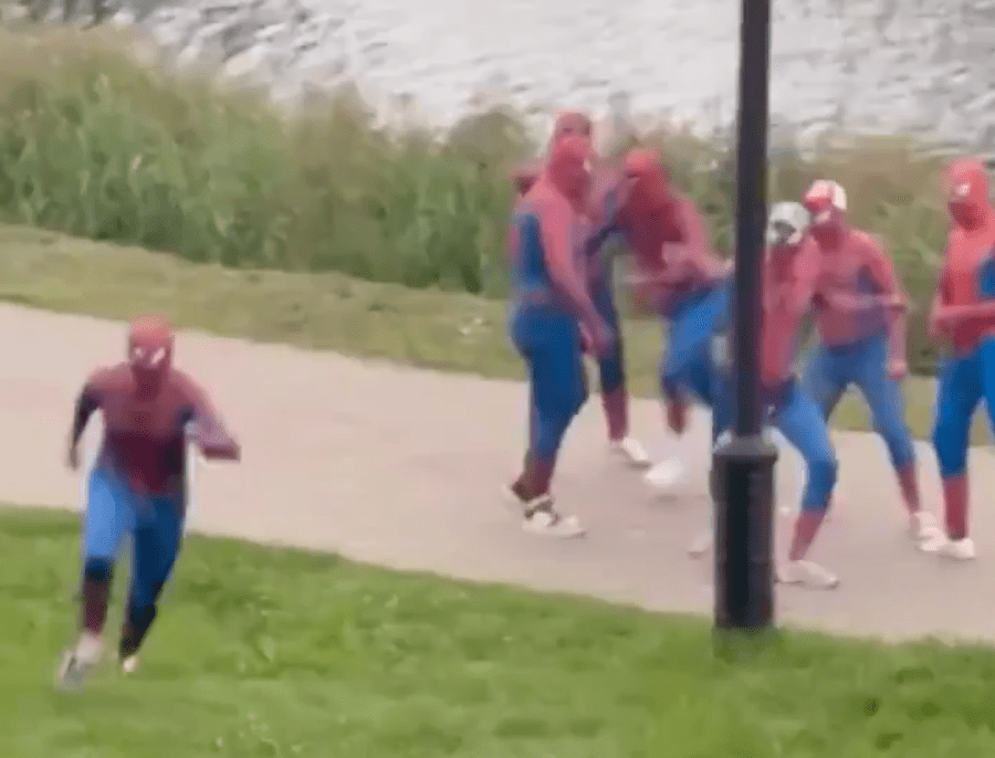 This meet up is probably planned, but the thought of a bunch of people wearing Spider-Man costumes bumping into each other is way more fun.