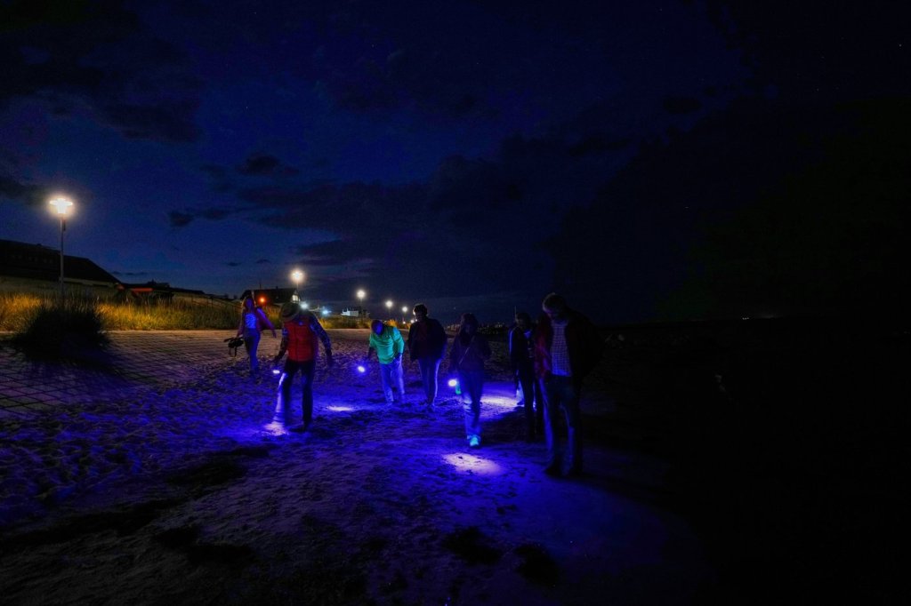 Participants hold a glass of salt water and a black light lamp in their hands to examine amber during a guided amber hunt for tourists on the beach of the Baltic Sea resort of Dahme, Germany, Tuesday, Sept. 2, 2025. (AP Photo/Markus Schreiber)