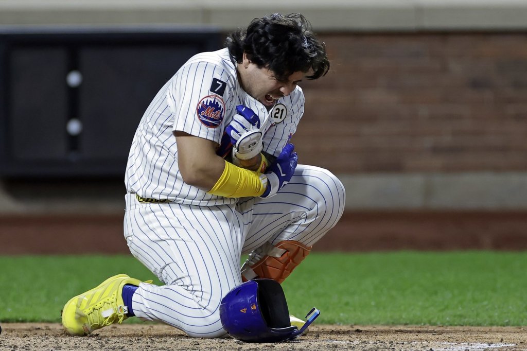 Alvarez was lifted for pinch-runner Hayden Senger but appeared on the Mets’ bench minutes later, smiling and sporting a large wrap around his left arm. He later joined the handshake line following New York’s victory.