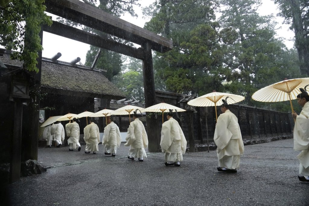 The rebuilding process begins as priests dressed in starched robes bang drums and march to Ise’s inner shrines for prayers.