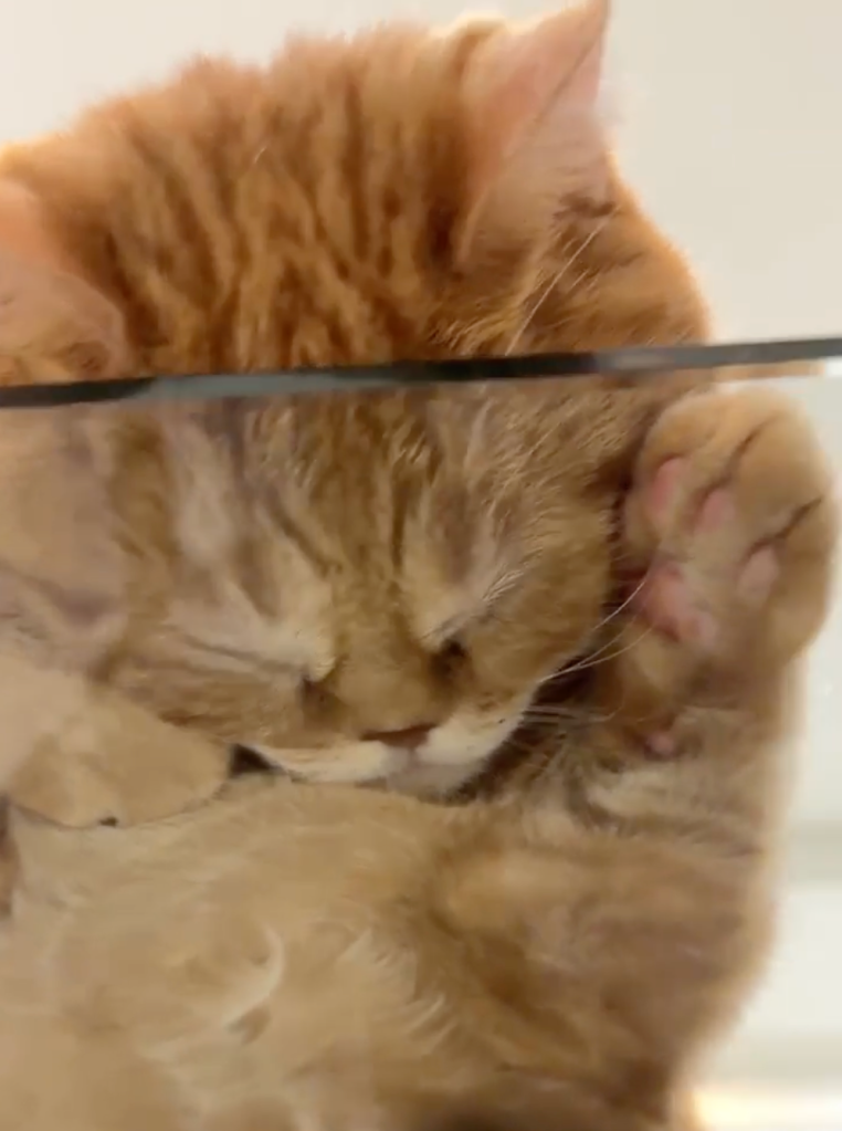 This orange fella was caught by his human sound asleep on a glass tabletop.