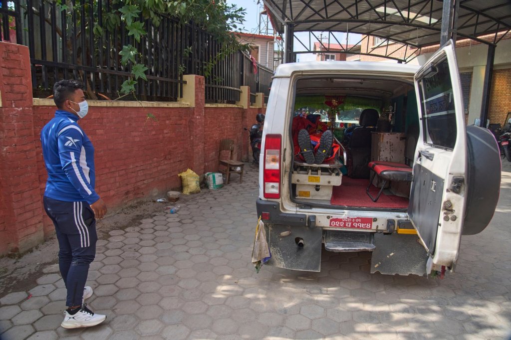 An ambulance carrying the body of a climber killed in an avalanche on Mount Yalung Ri arrives at the morgue of Tribhuvan University Teaching Hospital in Kathmandu, Nepal, Wednesday, Nov. 5, 2025. (AP Photo/Niranjan Shrestha)
