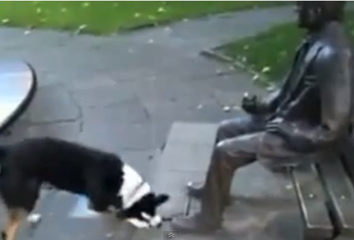 Something here seems to suggest the statue is more likely to throw the stick than the guy with the camera.