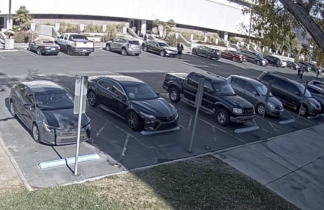 LAS VEGAS (AP) — Images of a campus police officer diving behind a patrol vehicle…