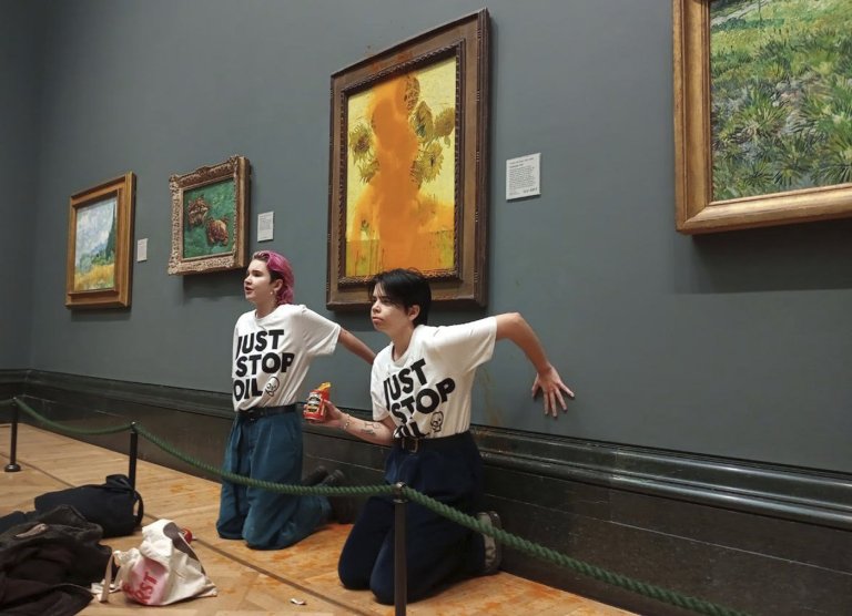 LONDON (AP) — Two British climate activists were sentenced on Friday for throwing tomato soup…