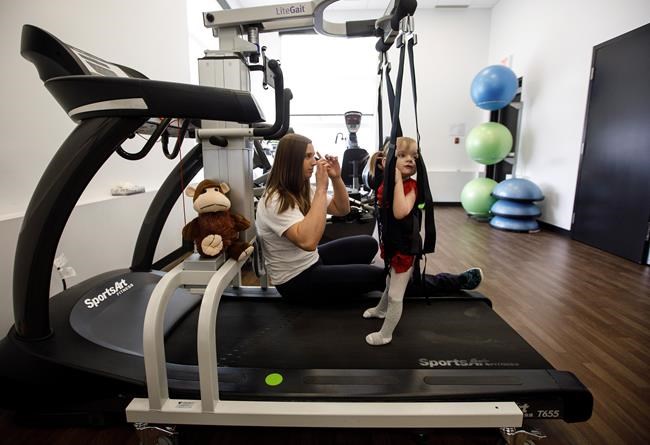 EDMONTON – Evelyn Moore sings the alphabet song as her tiny running shoes plunk down…