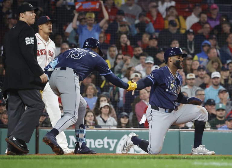 BOSTON (AP) — Jake Mangum had four hits, and Junior Caminero drew a bases-loaded walk…