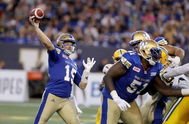 TORONTO – Running back Andrew Harris and quarterback Matt Nichols of the Winnipeg Blue Bombers…