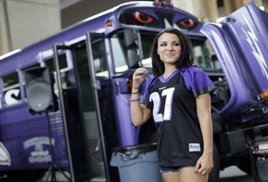 BALTIMORE – Music blared from the purple bus, and Baltimore Ravens fan Racquel Bailey stood with drink in hand amid her usual tailgate buddies while making a bold fashion statement: a black, rhinestone-decorated jersey with the white No. 27.