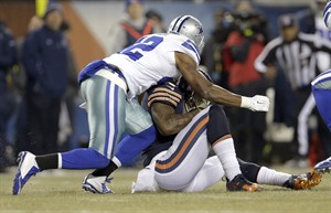 CHICAGO – Bears receiver Brandon Marshall left the stadium in an ambulance after sustaining a rib injury during Thursday’s game against the Dallas Cowboys.