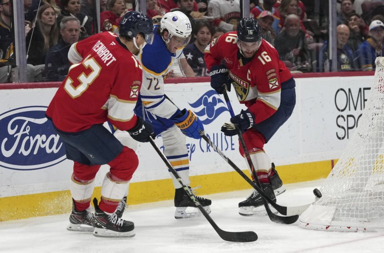 NEW YORK — Forwards Aleksander Barkov and Sam Reinhart of the Florida Panthers and Anthony…