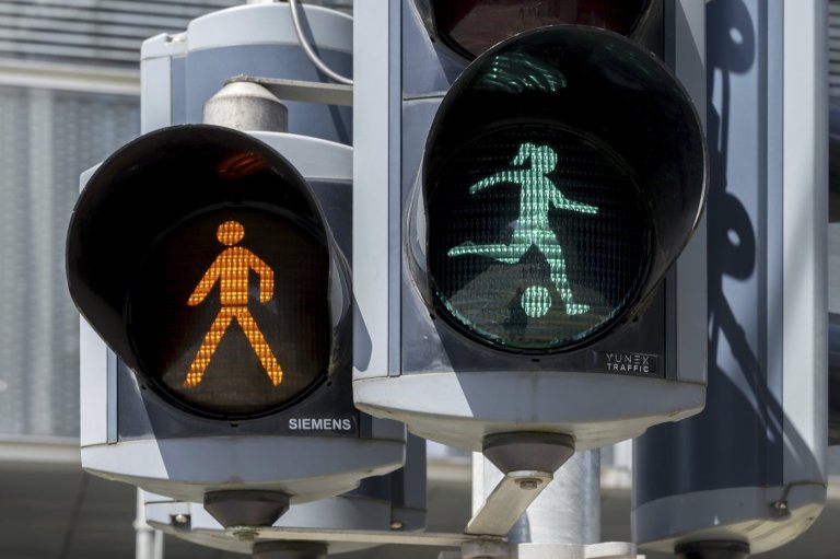 BASEL, Switzerland (AP) — Law-abiding pedestrians wait for the green woman kicking a soccer ball…