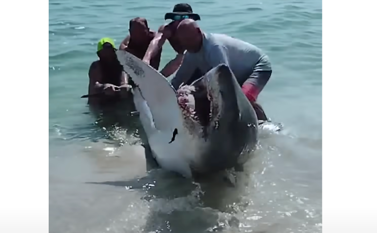 A vacationing couple took matters into their own hands when they spotted a shark stranded…